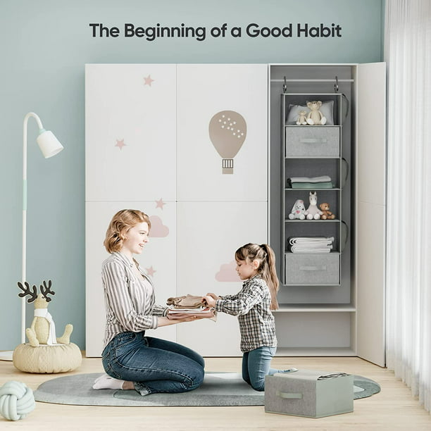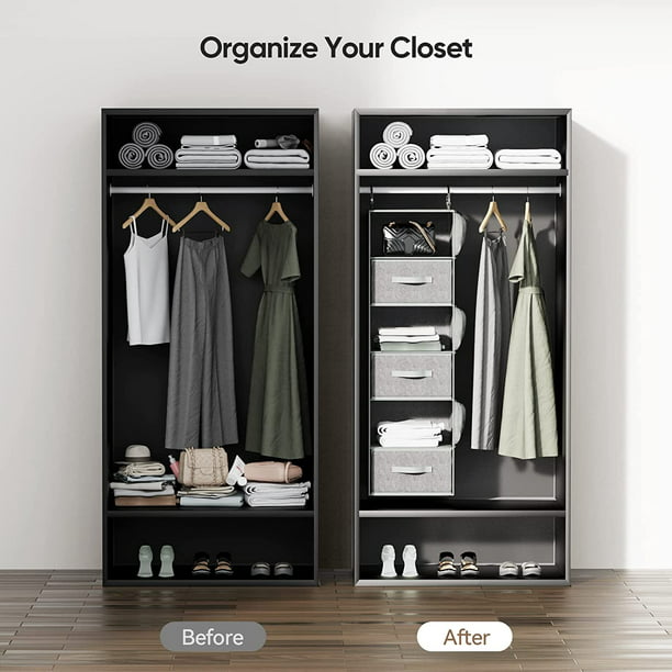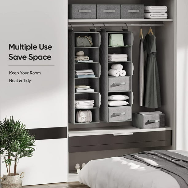 - PRACTICAL CLOSET ORGANIZER: The hanging closet organizer with drawers uses the vertical space in your closet to maximize capacity. The contemporary fabric and stylish color fits in well with any design style and aesthetic.