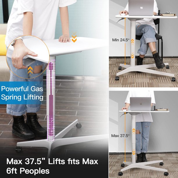- ERGONOMIC HEIGHT ADJUSTMENT - The mobile standing desk help you get rid of the sedentary work habit, relieve pressure along your back and reduce strain on neck and shoulders. The powerful gas spring lift system makes it raise and lower the movable desk smoothly from 24.5" to 37.5" with an easy-to-use side handle.