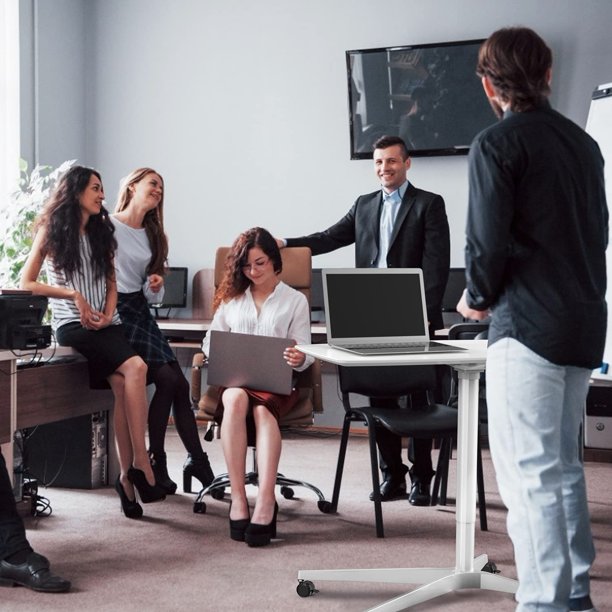 A desk that combines with practical and aesthetic is right here for you! A mobile standing desk with adjustable height enables you to choose sitting or to stand freely. A laptop desk with wheels allows you to roll it to any place throughout your home as you like. Solid and Sturdy Construction makes this rolling stand-up desk more stable. The portable mobile desk is great for storage, provides ample tabletop to place your laptop and other things.