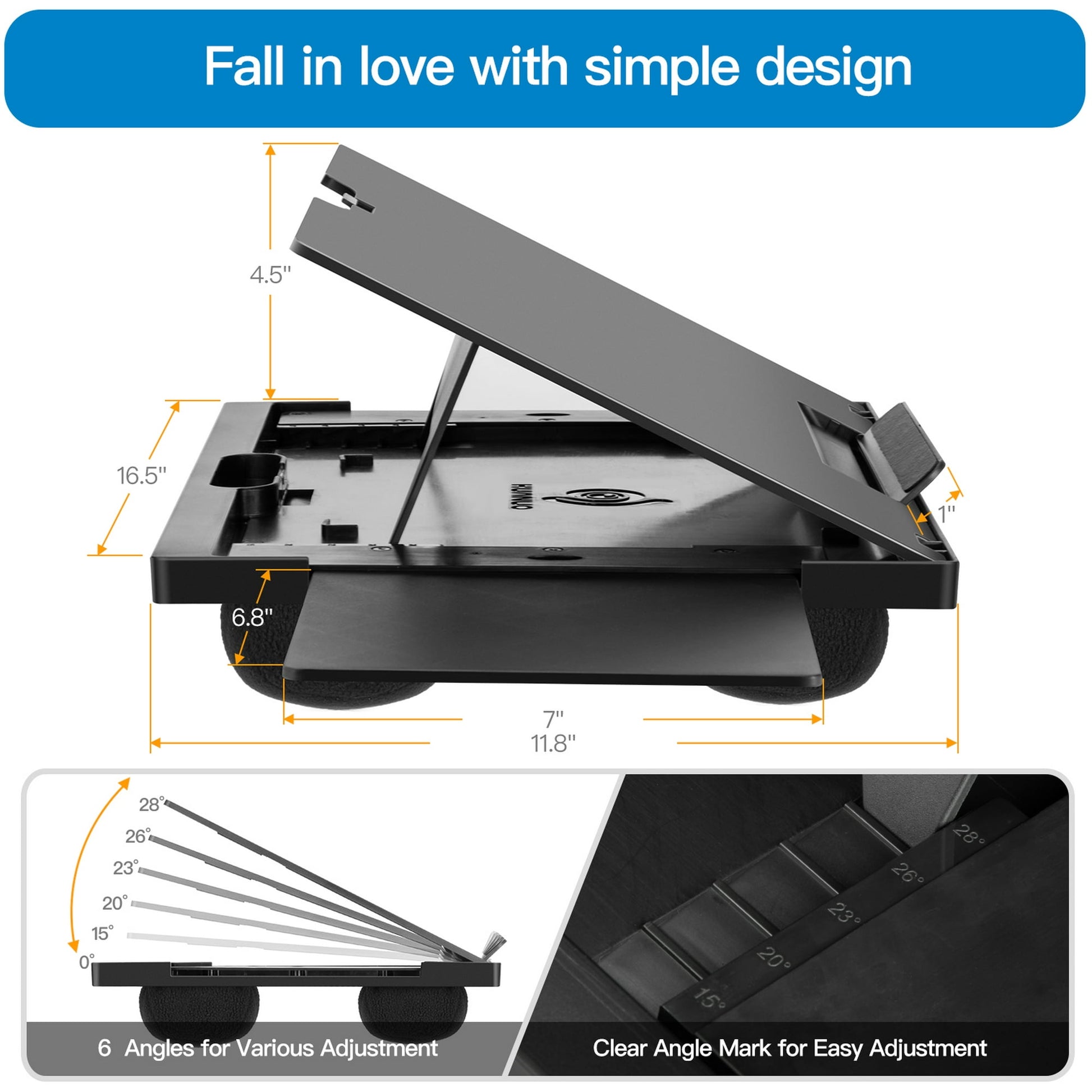 This laptop stand has 6 tilt angles (0°/15°/20°/23°/26°/28°), you can choose the most comfortable angle for viewing or typing.